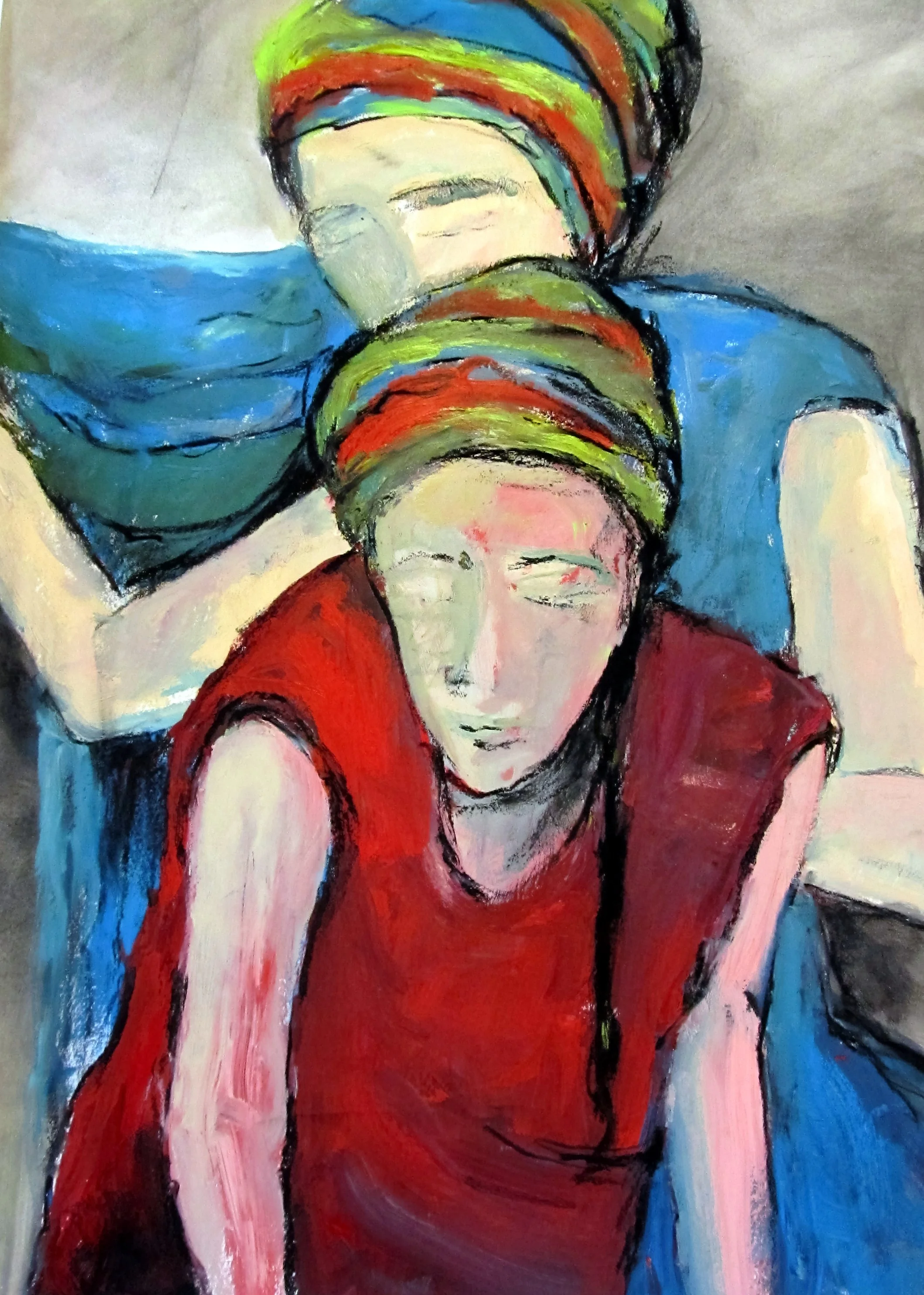 Rarely do I begin painting on a blank canvas, but rather first apply a solid color background, or loose color wash, which may or may not be visible in the finished piece. Sometimes this background becomes a reference point or integral part of the composition. Other times it is completely obliterated, yet still influences the color palette.